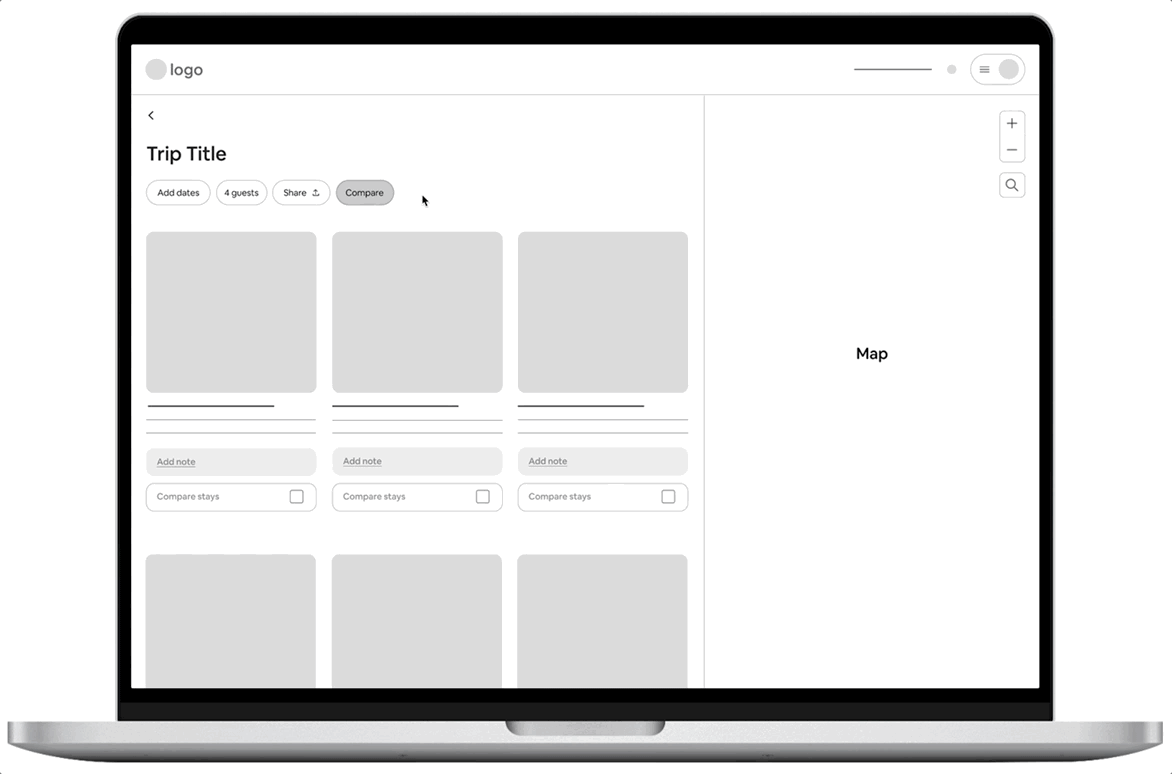Interview insights and the user journey map revealed that users typically compare stays by opening multiple tabs or saving listings to a wishlist. To determine the most intuitive place for the Compare feature, I first created a sitemap of Airbnb’s existing information architecture. I then mapped the feature against user behaviors and journey touchpoints to identify the most natural integration point.